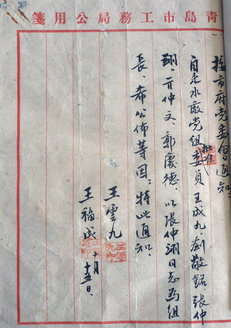 1949年10月15日,自来水厂接工务局通知:市府党委会批准自来水厂成立党组。同年10月14日,接建设局党总支文件:经市府党委会批准,自来水厂成立中共党支部,王成九任自来水厂第一任党支部书记。这是从1926年鲁伯峻创立自来水厂党支部遭破坏后,中共党组织又在青岛自来水厂成立,并将领导自来水厂全体员工,为确保青岛市的自来水事业而奋斗。