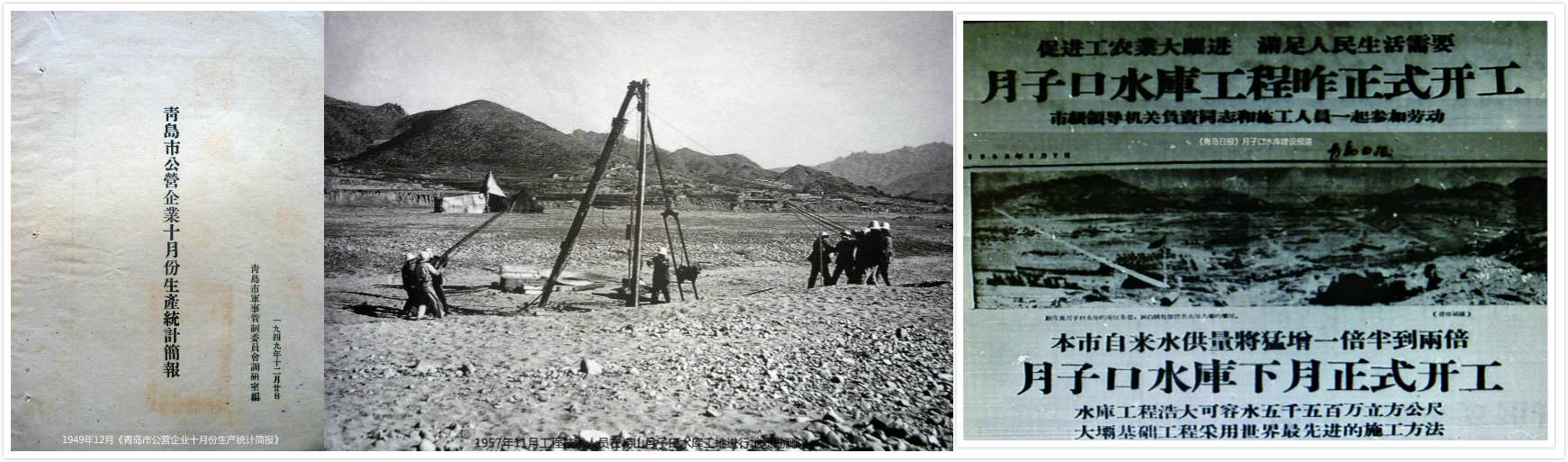 1949年6月2日青岛解放,社会面临百废待兴,军事管制委员会实业部接收、接管自来水厂后,依靠员工发动群众,生产很快恢复正常。据青岛市军管会编制的《青岛市公营企业十月份生产统计简报》记载,中华人民共和国成立的第一个月,即1949年10月全市供水量546542吨,日供水量平均只有1.8万吨,远远满足不了新生政权的社会生产和居民生活用水需求,为尽快恢复生产,保证供水,自来水厂制订了“三年计划”蓝图书(1950-1952),对生产进行挖潜,对设备进行改造。1952年至1956年在全厂职工中进行增产节约的社会主义劳动竞赛,日供水量达到3.8万立方米,但水源紧缺,供不应求的矛盾仍阻碍着生产的进步和社会的发展。由于供水不足,青岛多家工厂被迫停产,居民吃水限量,人均用水量不足0.56立方米/月。时任青岛建设局市政管理科科长的姜震在回忆录中写道:解放初期,多年春旱缺水,百姓吃水空前紧张,许多水龙头前经常排起挑水的长队,百姓吃水成了大难题,要解决青岛吃水问题必须扩充水源。